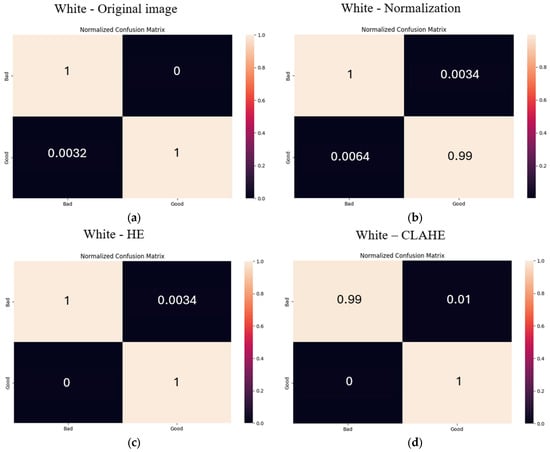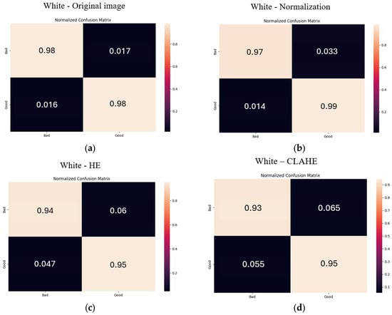 Confusion matrix of adaptive MobileNetV2 under white light. (a) Original image, (b) normalization, (c) HE, and (d) CLAHE.