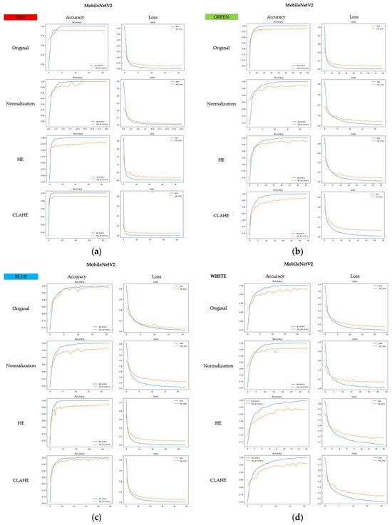 Training and validation accuracy and loss curves of MobileNetV2. (a) Red light, (b) green light, (c) blue light, and (d) white light.