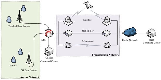 As illustrated in Figure 1, the network architecture of an emergency communication system is jointly composed of a transmission network and an access network []. The access network focuses on rapid connectivity of field terminal devices, utilizing technologies like trunked intercoms and 5G mobile networks to provide rescuers with messaging, voice, and low-latency data services, ensuring real-time command at the front line. The transmission network adopts a redundant architecture integrating multiple links such as satellite, microwave, and fiber-optic cables, and can forward data through public network to establish an efficient and stable high-speed information transmission channel between the rear command center and the disaster site []. This multi-dimensional transport mode not only significantly enhances video transmission quality but also ensures communication continuity in extreme environments through redundant link backup mechanisms.