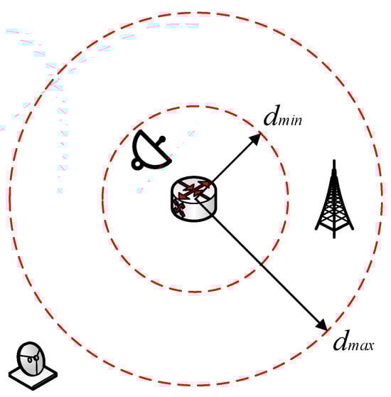 - Deployable range. As presented in Figure 2, the spatial distribution of elements must satisfy dual constraints, avoiding exceeding the maximum communication distance while preventing signal interference caused by overly close proximity . To address this, a dynamic reward function is constructed using a Gaussian formulation.Figure 2. Diagram of distance range between different elements.