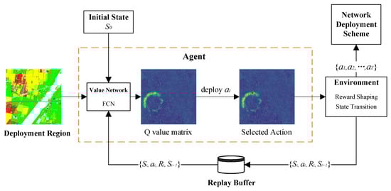 The emergency communication network deployment model we propose is based on an improved Double DQN (DDQN) [] algorithm, with a core architecture comprising three major parts: agent, experience replay buffer, and environment, as illustrated in Figure 3.