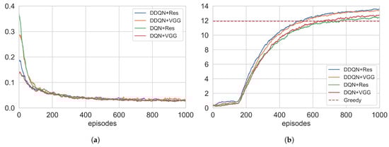 As shown in Figure 5a, the four combinations exhibit similar convergence characteristics in loss function trends, indicating minimal differences in convergence speed. However, the long-term performance comparison in Figure 5b reveals that the DDQN significantly outperforms the DQN after training stabilization. The improved average cumulative reward demonstrates the DDQN’s superior capabilities in strategy optimization and long-term return potential. Further analysis of value network structures shows that ResNet-based models achieve better overall performance compared to VGG modules, which correlates with ResNet’s residual architecture enabling stronger approximation capabilities for complex value functions.