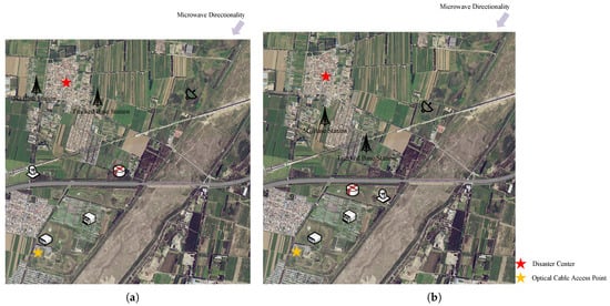 To provide a more intuitive comparison of performance differences in emergency communication network deployment between the proposed model and the greedy strategy, we conducted a visual comparative analysis of deployment results generated by both algorithms. To ensure experimental comparability, both groups adopted identical parameters, including microwave direction, disaster center, optical cable access point, on-site command center, and deployment terrain.