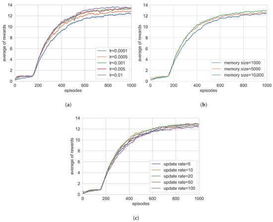 The sensitivity analysis of the learning rate reveals a clear convergence boundary effect, as illustrated in Figure 7a. When the learning rate is too low (lr = 0.0001), insufficient weight updates slow down convergence; conversely, an excessively high learning rate (lr = 0.01) causes parameter oscillations, leading to significant fluctuations in the average reward during the convergence process. This phenomenon confirms the strong constraint of the learning rate on the gradient descent path in reinforcement learning. Therefore, during the training process, the training effect is the best when the learning rate is set to 0.005 or 0.001.