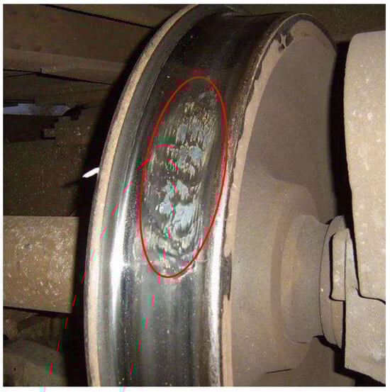 Due to uneven braking forces, wheels may experience locking and skidding, leading to the formation of wheel flats (as shown in Figure 1). A wheel flat causes the wheel to generate continuous and regular impacts on the rail, inducing abnormal rail vibrations. In extreme cases, the wheel–rail force can even reach 10–20 times the normal value []. Meanwhile, these impacts increase axle stress: the equivalent stress at the axle’s critical section can double compared to normal conditions, potentially causing axle fractures and posing significant safety hazards to train operations.