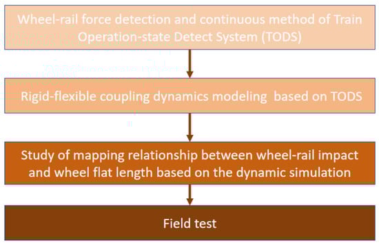 Following extensive research on wheel flats by scholars in recent years, the mechanisms of wheel–rail impact and the effects of flats on vehicle dynamics have been fundamentally clarified. Leveraging the impact characteristics and interaction patterns of wheel flats, diverse detection methods have emerged. Among these, wheel–rail force-based approaches are most widely adopted, including China’s TPDS (Truck Performance Detection System) [,,,] developed by the China Academy of Railway Sciences and TTCI’s (Transportation Technology Center Inc.) WILD (Wheel Impact Load Detector) system in the U.S. In prior work [], the authors proposed a novel detection method: the Train Operation State Detection System (TODS), which uses a discrete wheel–rail force connecting method to detect spatial continuous wheel–rail force. This method offers advantages of reliable data acquisition, low installation cost, and less track damage []. However, since traditional wheel–rail force detection relies on discontinuous sampling data—distinct from directly measured continuous wheel–rail forces on the wheel itself—questions remain about whether conventional impact models and feature recognition algorithms are compatible with this new detection framework. Further investigation is required to validate the applicability of existing impact formulations and diagnostic algorithms for discontinuous force data.