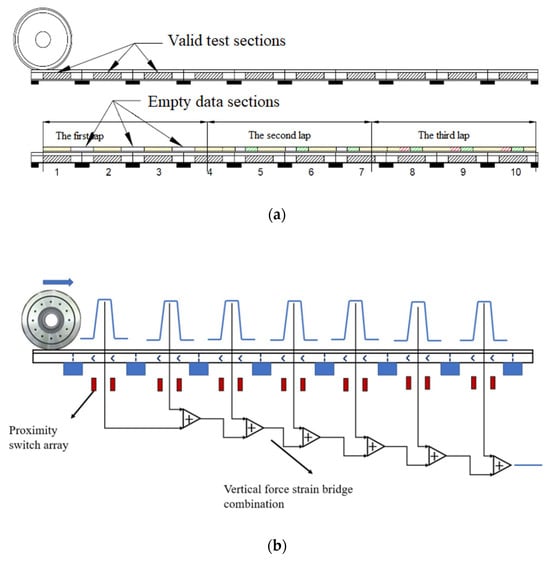 Wheel–rail force detection methods are categorized into vehicle-mounted and wayside systems. Due to spatial limitations, wheel–rail forces measured on the track generally exhibit discrete and intermittent characteristics. In contrast, wheel–rail forces measured via vehicle-mounted sensors are typically continuous in both spatial and temporal dimensions. For wheel fault identification, wayside detection offers the most cost-effective solution. By attaching strain gauges to the rail web, this method measures wheel–rail forces within the span between two sleepers []. An alternative approach involves replacing sleepers with force sensors to monitor vertical forces at specific rail intervals. Among these, the shear strain gauge method is particularly efficient and economical, prompting extensive targeted research by scholars in recent years [,,,,]. However, a critical limitation exists: the shear method can only capture wheel–rail forces within a single sleeper span. As a train passes through the detection zone, the collected data reflects only a small segment of the wheel tread. To overcome this, multiple detection zones are required so that combined data from all channels can cover the entire wheel circumference. Data from these parallel channels must then be integrated into a unified system, concatenated according to temporal and spatial sequences, to reconstruct continuous wheel–rail force profiles for each wheel.