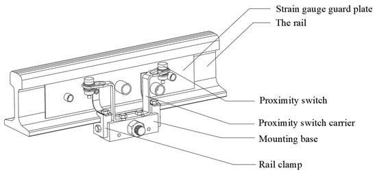 Figure 4 illustrates the rail-mounted proximity switch configuration. The sensing assembly is integrated into a custom-designed fixture comprising three rail clamps, a mounting base, a proximity switch carrier, two proximity switches, and two strain gauge guard plates. The entire fixture is anchored via the mounting base. The proximity switches are mounted on the carrier with a longitudinal center-to-center spacing of 240 mm, positioned directly above the shear measurement points on both rail sides. The switch tops are maintained at a 45 mm vertical clearance from the rail surface to ensure safety against rolling stock gauge intrusions. The proximity switch carrier attaches to the mounting base through two bottom circular holes, while the fixture secures to the rail foot via two bottom rail clamps and one opposing side clamp. As a wheel traverses the detection zone, the proximity switches record entry and exit timestamps. These timestamps enable the extraction of zone-specific wheel–rail force data, which are then temporally aligned and concatenated with data from adjacent segments (see Figure 4), forming a complete circumferential force profile. This design offers dual advantages: it avoids structural modification of the track and rail (since it is a non-intrusive installation method), ensuring low installation cost, while enabling simultaneous detection of additional wheel defects such as misalignment.