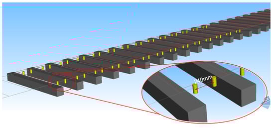 The hybrid coordinate system method was employed to model wheel elastic deformations while excluding the effects of parametric resonance from vehicle equipment. To generate wheel–rail force outputs consistent with field data collected by the TODS, a series of pressure sensors (a measurement module in SIMPACK, which can be understood as a data-readout tool) were integrated into the track model at 240 mm intervals between sleepers, as depicted in Figure 6. This sensor configuration enables precise timing of wheel passage through each detection zone, facilitating subsequent concatenation of discrete wheel–rail force measurements.