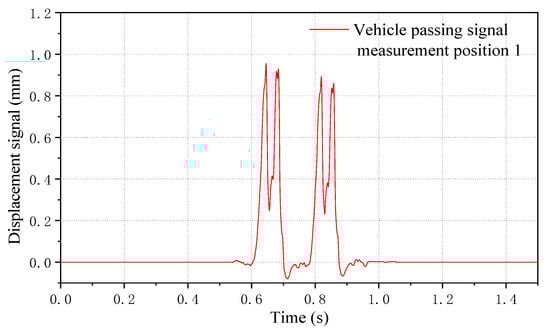 Continuous periodic impact is a defining characteristic of wheel flat faults. Figure 8 illustrates continuous wheel–rail force profiles under a flat condition, but the TODS measures discrete wheel–rail forces. The model’s displacement sensor outputs mimic vehicle passage signals (as an alternative to the proximity switch in the simulation model), as shown in Figure 9. To align with real-world wayside detection data, discrete wheel–rail forces from the simulation model are processed, as depicted in Figure 10.