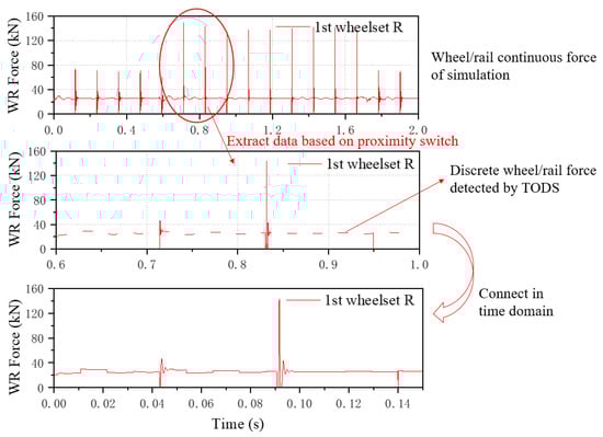 The top of Figure 10 shows the continuous wheel–rail force signal measured by the on-board wheel–rail force testing unit in SIMPACK. By combining the time when the vehicle enters/leaves the valid sections (such as the signal shown in Figure 9), the continuous wheel–rail force signal can be segmented according to the time of the effective testing interval, resulting in the discrete wheel–rail force signal shown in the middle of Figure 10. Finally, the discontinuous, discrete wheel–rail force signals in Figure 10 are connected in the same time domain, yielding the simulated concatenation wheel–rail force signal at the bottom of Figure 10, which is consistent with TODS.