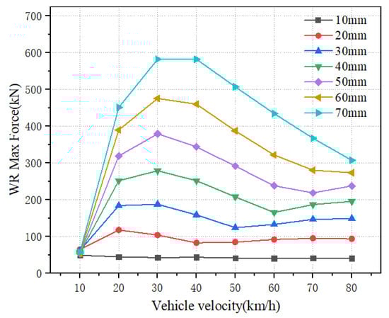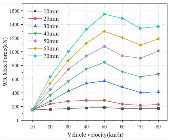 Figure 12 presents wheel–rail force simulation results for a 50 mm wheel flat under heavy-load conditions at 30 km/h. Correspondingly, the vehicle traverses the elastic track region between 0.6 and 1.7 s. Under heavy load, a 50 mm flat at 30 km/h generates a peak wheel–rail impact force of 596 kN—4.768 times the static wheel–rail force and 3.97 times the impact force under empty-load conditions. By extracting all peak forces, the force–speed relationship plot in Figure 13 is generated.