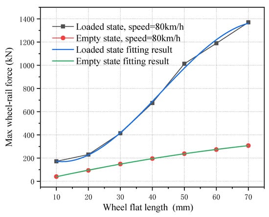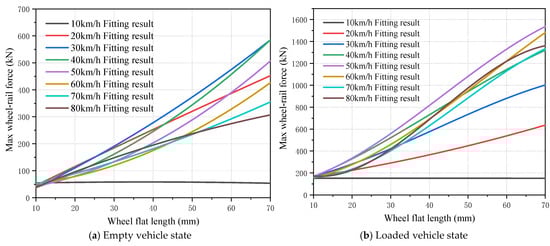 Simulations were conducted on empty and loaded vehicles, each featuring a flat on the right front wheel of the leading bogie, with a fixed speed of v = 80 km/h. Considering the trade-off between simulation accuracy and available computational resources, a second-order polynomial was employed for curve fitting of empty vehicle data, while a third-order polynomial was applied to loaded vehicle data. The fitting result is shown in Figure 14, where both empty load state and loaded state show a good mapping result.