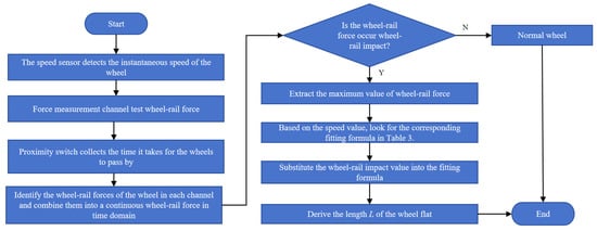 According to the mapping relationship, by combining the vehicle speed measured by the TODS equipment and the wheel–rail force impact value, the flat length of the wheel can be deduced. The data processing process is shown in Figure 16. When the speed is not an ideal value (such as 56 km/h), the interpolation method can be used; that is, after calculating the values of adjacent speeds (such as 50 km/h and 60 km/h), perform the interpolation method to obtain the flat length under the corresponding speed condition.