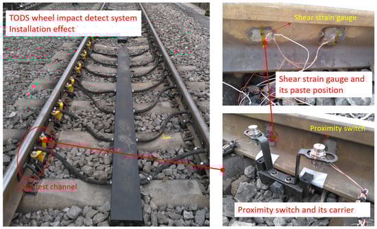Shear strain gauges were strategically mounted on both the left and right rails to measure wheel–rail forces. The installation encompasses 14 rail spans. Each measuring point consists of four strain gauges, which are combined through a bridge circuit to form one measuring point. One rail span has two measuring points (one on the left and one on the right), utilizing a total of 28 strain gauge channels. Additionally, a proximity switch was affixed to one side of the rail, serving as a trigger to accurately record the precise moments when wheels enter and exit the detection zone. Table 4 details the key parameters of the strain gauges and proximity switch, while Figure 17 illustrates the actual installation configuration.