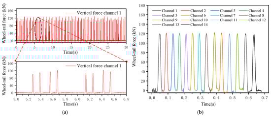 A train’s whole wheel–rail forces collected in a single test channel (a). The discrete wheel–rail force obtained by a single wheel passing through the whole system (b).