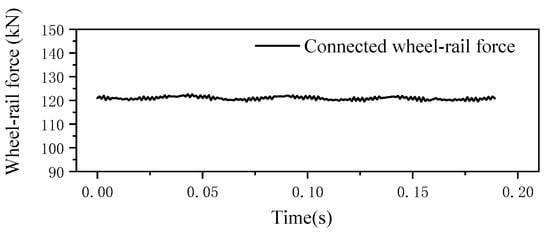 The wheel–rail force profile obtained through the concatenation method is presented in Figure 19. The data reveals that the fluctuations in the wheel–rail force remain within the normal operational range, devoid of significant burrs or wheel–rail impact signatures. This observation strongly suggests that the wheel is in excellent condition, free from surface defects such as wheel flats; it serves as excellent comparative data for the faulty wheel data. With a wheel–rail force magnitude of approximately 120 kN, it can be deduced that the vehicle is operating under a full-load condition, corresponding to a payload of around 76 t.