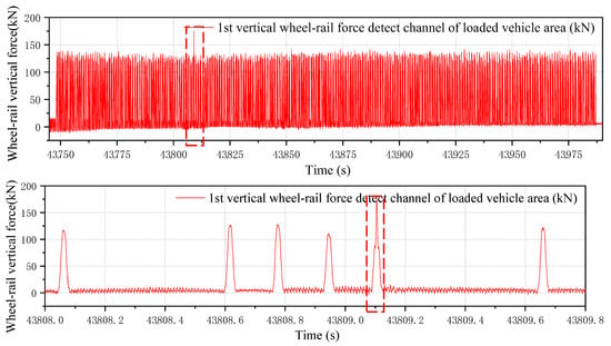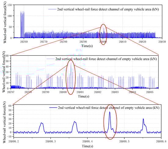 Figure 20 illustrates an abnormal wheel–rail force signal detected by the No. 2 left-side wheel–rail vertical force channel in an empty car line, with the channel positioned on the right side relative to the incoming vehicle direction. A magnified view of the wheel–rail impact reveals that the abnormal force signature originates from wheel tread damage. Retrieve all the wheel data of this wheel from all channels and connect them in the time domain; the continuous wheel–rail force results can be obtained, as shown in Figure 21.