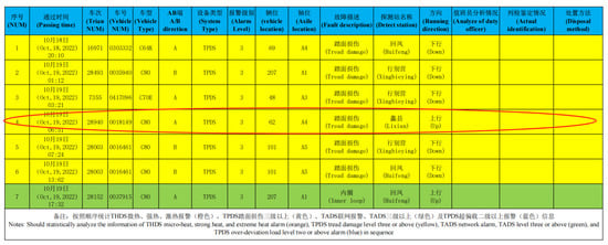 TPDS fault alarm data comparison (to ensure the authenticity of the data, the text has retained the Chinese description).
