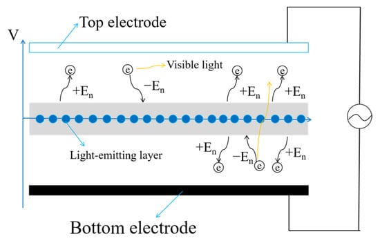ZnS:Cu is a classic type of intrinsic EL material; its EL process originates from the collision ionization and radiation recombination mechanism of carriers under a high electric field [38]. As shown in Figure 1, under an alternating electric field, electrons are injected into the ZnS:Cu light-emitting layer through the transparent electrode and the metal back electrode. When the applied electric field intensity reaches approximately 1 kV/mm, the carriers acquire sufficient kinetic energy under the acceleration of the electric field and undergo inelastic collisions with the Cu2+ luminescent centers in the lattice [39,40]. This process causes the electrons in the luminescent center to be excited to a metastable energy level and then return to the ground state through radiative transitions, releasing green photons with a wavelength of 505 nm [39,40]. The field-driven excitation mechanism provides the fundamental basis for utilizing ZnS:Cu in high-voltage sensing applications, where electric field strength can directly govern EL output.