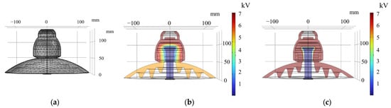 Simulation of electric field distributions in insulators. (a) Constructed insulator structure for simulation. (b) Electrical potential distributions of insulator with effective insulation performance. (c) Electrical potential distributions of zero-value insulator.