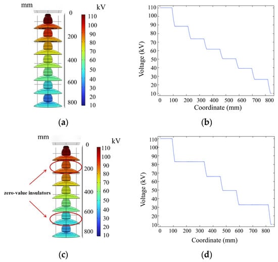 Voltage distributions of an insulator string containing 7 insulators. (a) Voltage and (b) electrical potential distributions of an insulator string with 7 insulators of effective insulation performance. (c) Voltage and (d) electrical potential distributions of an insulator string containing 2 zero-value insulators.
