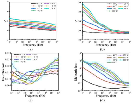 Frequency-dependent dielectric spectra of ZnS:Cu-doped epoxy composite coating. Variations of dielectric constant in (a) −100~20 °C, (b) −40~160 °C. Variations of dielectric loss in (c) −100~20 °C, (d) −40~160 °C.