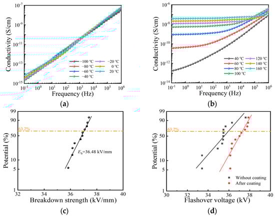Electric conductivity and insulation performances of ZnS:Cu-doped epoxy composite coating. Frequency dependent electrical conductivity in (a) −100~20 °C, (b) −40~160 °C. (c) The AC breakdown performances. (d) The AC flashover voltages of insulators.