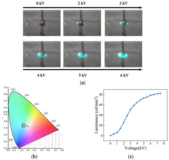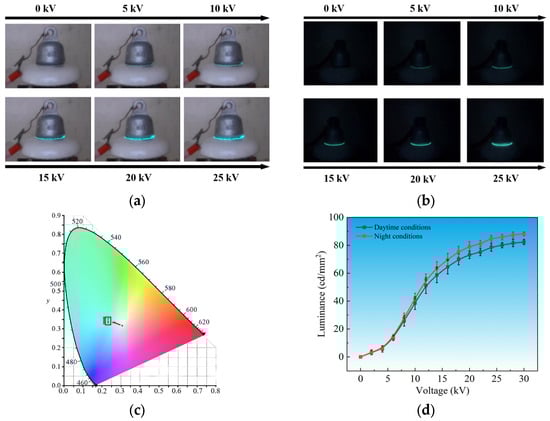 In order to evaluate the feasibility of EL coating sensing and indicating the voltage magnitude endured by insulators, different voltages were applied to both ends of EL-coated insulators with a surface coating thickness of 120 μm, and the luminescence phenomenon of EL coating under different voltages was observed. Under daytime indoor conditions (Figure 7a), the coating exhibited a clear blue-green EL response when the applied voltage exceeded a threshold of 5 kV. The luminous intensity increased progressively with higher voltages, demonstrating a strong voltage dependence. Nighttime experiments (Figure 7b) revealed a similar trend, with luminescent intensity enhancing as voltage increased. Notably, the chromaticity coordinates of the emitted light remained stable at (0.26, 0.31) across all tested voltages (Figure 7c), confirming the consistency and reproducibility of the luminescent color—a critical feature for practical sensing applications. The specific numerical relationship between voltage and luminous intensity (Figure 7d) displayed a linear increase within the 5–20 kV range. In particular, when the applied voltage exceeds 22 kV, the intensity saturated, suggesting that carrier injection had reached equilibrium, and further voltage increases did not significantly enhance light output. Interestingly, nighttime measurements recorded a 10% higher luminous intensity than daytime observations at identical voltages. This discrepancy is attributed to the absence of ambient stray light at night, allowing more accurate detection of the coating’s intrinsic luminescence.