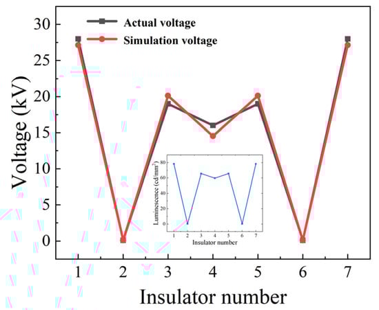 The above experimental results confirm that the EL coatings can effectively sense the voltage applied to individual insulators. To further validate their capability for detecting zero-value insulators, we conducted tests on a string of seven insulators (including two zero-value insulators) under an applied voltage of 110 kV. The voltage distribution across each insulator and the corresponding luminescence intensity of the coating were measured simultaneously (Figure 8). The coating exhibited distinct luminescence responses that clearly differentiated between functional and zero-value insulators. While healthy insulators showed measurable luminescence intensities proportional to their voltage loads, the zero-value insulators displayed negligible luminescence, as evidenced by the detailed inset in Figure 8. This direct correlation between luminescence absence and zero-voltage conditions demonstrates the coating’s effectiveness in identifying faulty insulators within a string.
