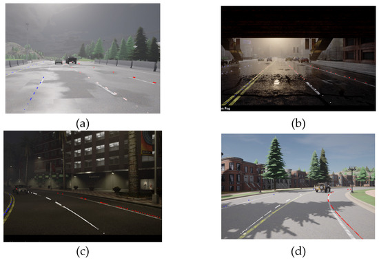Examples of environmental scenarios used and generated in Carla: (a) highway during the day and cloudy; (b) rain, urban; (c) night, urban; (d) day, clear sky, suburb.