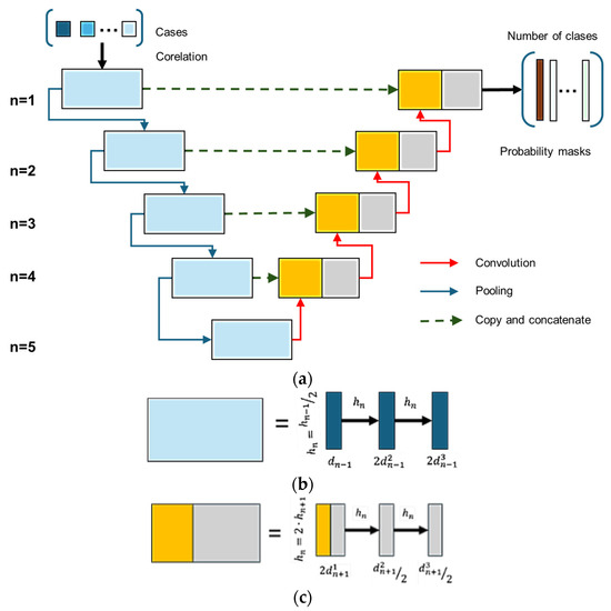 Structure and functionality of the U-Net architecture: (a) general architecture and information transfer paths; (b) structure of the pooling blocks; (c) structure of the convolution blocks (adapted from [29]).