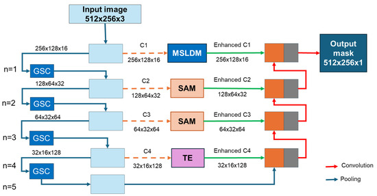 Hybrid U-Net network architecture (GSC—geometrical skip connection, SAM—spatial attention module, MSLDM—multi-scale detection module, TE—transformer encoder).
