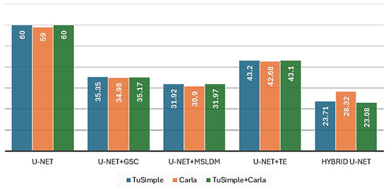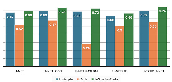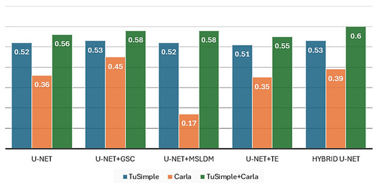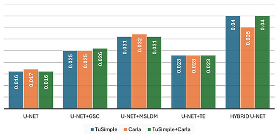 The experimental results obtained show a clear improvement in performance with the introduction of the hybrid U-Net architecture, compared to the standard U-Net model (Table 1 and Table 5, and Figure 8, Figure 9, Figure 10 and Figure 11). On all three datasets used (TuSimple, Carla, and TuSimple+Carla), the hybrid U-Net achieved superior scores on both the mIoU and F1 score parameters. The most notable increase was observed on the mixed dataset TuSimple+Carla, where the mIoU increased from 0.56 to 0.60 (+7%) and the F1 score from 0.69 to 0.74 (+7.2%).