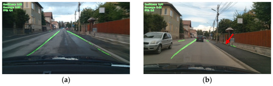 A lane detection model, based on a neural network that learns to decode the markings directly instead of relying on post-processing to define the lanes, is proposed in [23]. The method is based on a neural network designed to draw the detected lines on the recorded images, and thus the post-processing part becomes faster. The network training was performed on two datasets (images taken from the TuSimple and CULane databases), and the results obtained showed an accuracy of 95.2% on these datasets.