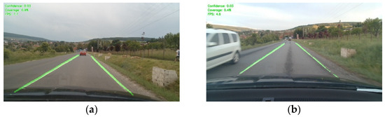 In order to quantify and compare the efficiency of the neural networks (hybrid U-Net vs. U-Net) in real time, the following notions were introduced: confidence and coverage. The confidence metric (Equation (3)) quantifies the average confidence of the neural network in classifying each pixel as belonging to a traffic lane, being expressed as the arithmetic mean of the probability values generated by the model. In Equation (3), each element pij represents the probability that pixel (i,j) is part of a lane, and H and W are the height and width of the input image: