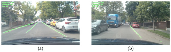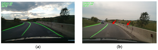 Another important parameter is the F1 score, a parameter that combines two factors, precision and recall (Equation (2)). The precision factor is defined as the fraction of detected lane pixels that are correct, and the recall factor represents the fraction of ground lane pixels that are detected: