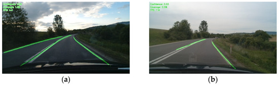 The performance of the hybrid U-Net and U-Net neural networks was comparable when the lane lines were clearly marked and the markings were straight (Figure 13b.) The confidence level was the same for both models (0.04) and the coverage metric was higher for U-Net (by 0.4%) because the U-Net network was less precise. In the case of curves (Figure 15 and Figure 16), the hybrid U-Net had significantly higher performance with a confidence level 0.02 higher in both cases and the coverage metric was almost double (1.1% vs. 0.6% and 1.0% vs. 0.5%, respectively).