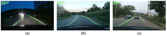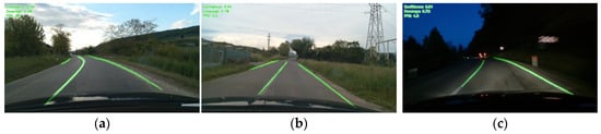 Real-time results using hybrid U-Net for traffic lane detection: (a) cloudy and sloping road, (b)—cloudy and straight road, (c)—at night and curvy road.