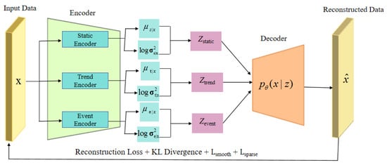 In the study of time series data, researchers have looked into and suggested different VAE-based time series decoupling models. These models break down complex time series data into its different parts, like trends, seasonality, and random noise [,,]. Medical data that shows changes over time is often caused by a mix of things. It is not enough to look at trends and seasons separately. We need better ways to separate these features that are more meaningful for doctors and patients. As a new way of thinking about data, disentangled representation learning has been studied a lot by academics recently []. The variational autoencoder (VAE) is a representation learning model that is often used. It achieves decoupling by learning a low-dimensional representation of the data and imposing specific a priori distribution constraints on it [].