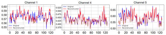 To qualitatively assess the reconstruction fidelity of CoTD-VAE, we have designed Figure 3 to present a focused, narrative-driven analysis. Channel 4 serves as an example of high-fidelity reconstruction. Here, the reconstructed signal (red curve) closely tracks the original signal’s (blue curve) primary peaks and troughs, demonstrating the model’s capability to preserve core signal dynamics when the underlying pattern is clear. In contrast, Channel 5 highlights a more sophisticated capability: event capture. The model successfully identifies and reconstructs the significant, sharp dip around the t = 60 mark, proving that it can distinguish meaningful transient events from random noise. Finally, Channel 1 offers a transparent view of the model’s limitations and inductive biases. Faced with high-frequency oscillations, the model produces a significantly smoothed reconstruction. This behavior, a direct consequence of our Trend Smoothness Loss, shows the model’s tendency to function as a denoising filter, which is beneficial for trend extraction but comes at the cost of losing fine-grained texture. This balanced, qualitative evidence provides a much more nuanced and convincing assessment of CoTD-VAE’s capabilities than a simple visual inspection of all channels would allow.