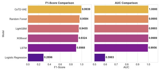 Table 4 presents the detailed classification results. While all baseline models achieved excellent performance, CoTD-VAE demonstrated the best performance. It achieved the highest F1-Score (0.9939) and a perfect AUC (1.0000), showcasing its superior predictive power. Notably, the performance of CoTD-VAE surpasses that of the standard end-to-end LSTM classifier (F1-Score 0.9939 vs. 0.8968). This result suggests that for this task, the structured disentanglement of static, trend, and event components in our model provides a more effective and powerful representation than the single, mixed hidden state learned by a standard recurrent neural network. Although tree-based models like Random Forest are highly efficient on this dataset, the unique advantage of CoTD-VAE lies in its generative and interpretable framework, which offers deeper insights beyond a simple classification output.