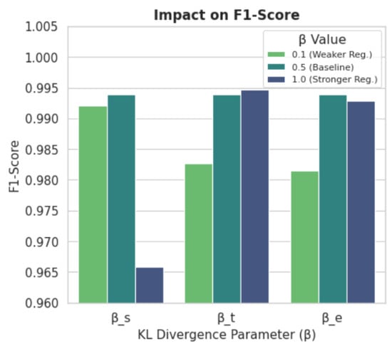 As shown in Figure 5, the model’s performance is notably sensitive to the KL divergence weights (). A critical finding is that applying stronger regularization to the dynamic components ( and ) while using weaker regularization for the static component consistently yields superior results. For example, increasing from 0.1 to 1.0 improved the F1-score from 0.9827 to 0.9947. Conversely, increasing over the same range caused a significant drop in the F1-score, from 0.9921 to 0.9659. This outcome strongly supports our core hypothesis: an effective model should learn generalized, abstract representations for dynamic patterns (trend and event) while preserving the rich, specific information inherent in a patient’s static baseline.