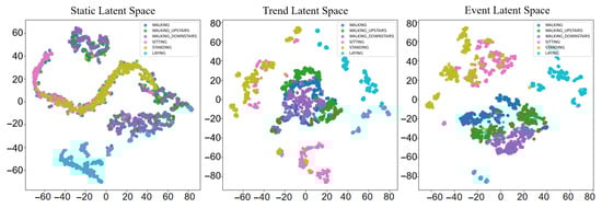 Conditional Variational Autoencoder (CVAE) [,]: CVAE introduces category information as a condition into the generation process and learns the conditional distribution of specific activity categories. The structure is similar to -VAE, but it introduces category embedding (dimension 8) in both the encoding and decoding processes. This allows the model to generate specific reconstructions and learn representations that are sensitive to specific conditions.
