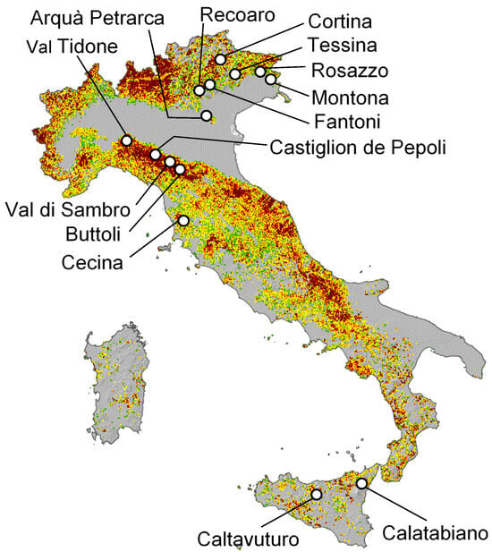 The location of the aforementioned sites along the Italian peninsula is shown in Figure 1, along with the Italian landslide hazard map compiled by ISPRA []. At present, the ISPRA database reports about 630,000 landslides, many of which reactivated after several years, decades, or even centuries of quiescence.