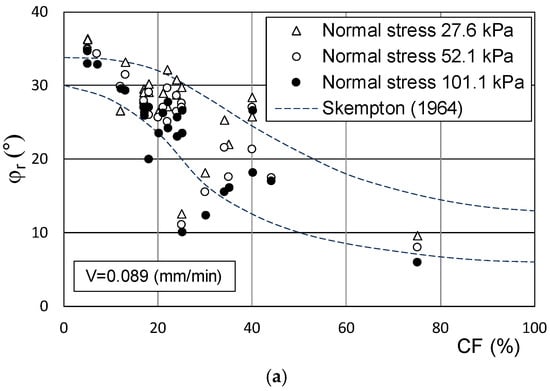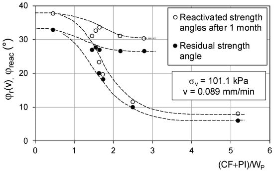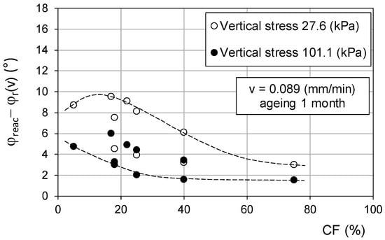 In the same Figure 11, the reactivated strength angles are compared with the corresponding steady residual, φr(v), also obtained at the same shearing speed and vertical stress as the first ones. As already stated by Miao and Wang [], it was observed that less plastic samples tend to develop a slightly larger increase in the reactivated strength angle in comparison to the more plastic ones. This fact is better highlighted in Figure 12, which shows the increase in the secant strength angle at reactivation, φreac − φr(v), as a function of clay content, CF, and considering both the minor and the major vertical stresses employed in the experiments, it is possible to note how the recovered strength angle seems to increase as the clay fraction decreases.