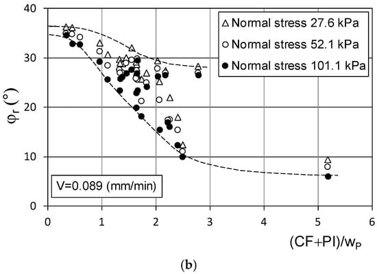 Compared with the representations making use of CF or PI alone, it was found that the parameter (CF + PI)/wP involves less dispersion of the data. Looking at Figure 2b, all the data are placed within a band limited by a lower and an upper envelope: the upper envelope delimits the samples with the largest residual strength angle, characterised by an interplay between lower plasticity, lower clay fraction, and lower vertical stress, whereas the lower envelope delimits the samples with the smallest residual strength angles, characterised by an interplay between greater plasticity, greater clay fraction, and greater vertical stress. The evidence that the secant residual strength angle decreases as the vertical stress increases proved that the residual strength envelopes are affected by non-linearity, especially at a low stress level.