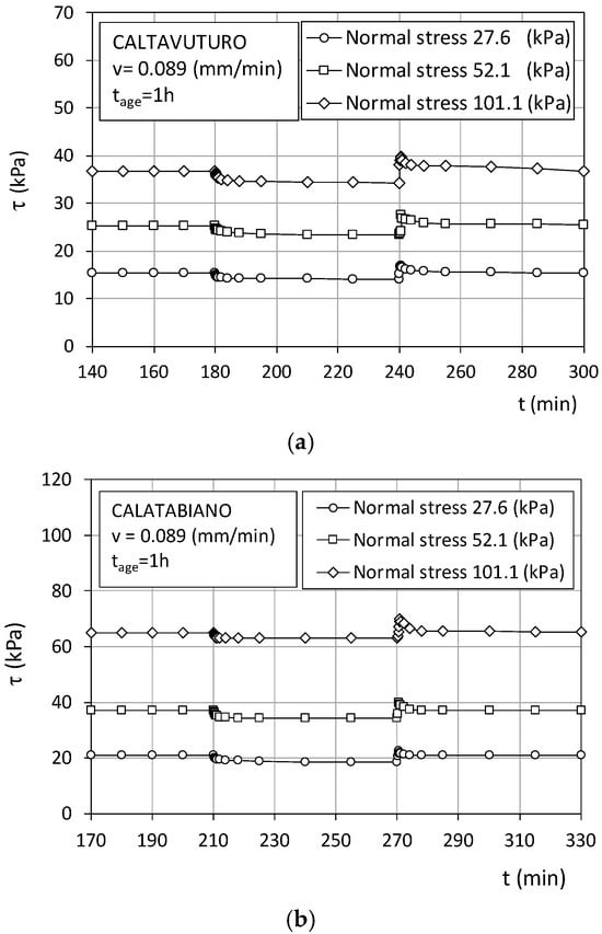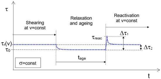 The time spent in the relaxation stage represented an ageing period, tage, during which the sample could have experienced variation in strength. Actually, ageing may occur under shear stresses also below or slightly above τ0, as investigated by other researchers [,,,]; in this research, only ageing at τ0 stress was considered.