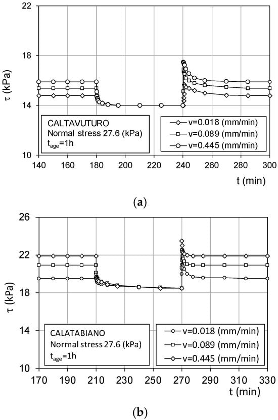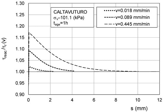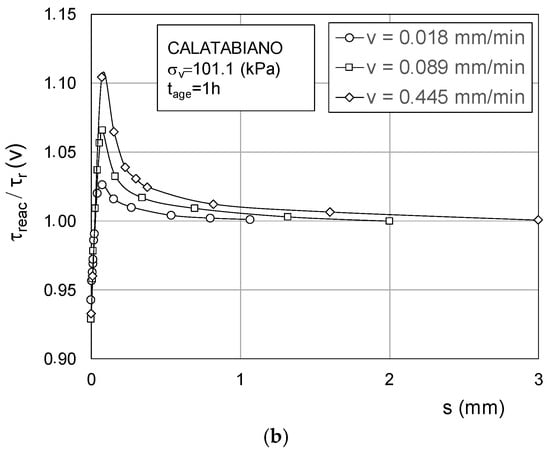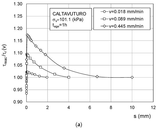 Figure 4 shows for both Caltavuturo (Figure 4a) and Calatabiano clays (Figure 4b) the trends of τ0, τr(v), and τreac, for vertical stresses of 27.6 kPa, 52.1 kPa, and 101.1 kPa, shearing speed 0.089 mm/min, and ageing of one hour, while Figure 5 shows, for both Caltavuturo (Figure 5a) and Calatabiano clays (Figure 5b), the trend of τr(v) and τreac, for shearing speeds of 0.018 mm/min, 0.089 mm/min, and 0.445 mm/min, vertical stress of 27.6 kPa, and ageing of one hour.