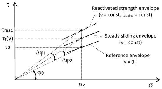 Schematic representation of the secant angle of residual strength, φ0, and its increments, ∆φ1 and ∆φ2, depending on vertical stress, ageing time, and displacement speed.